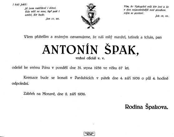 Ku konci srpna 1936 zesnul nám v Pánu milý bratr Antonín Špak, vrchní oficiál v.v., když dlel na letním bytě v Čechách. Byla to pro celý sbor citelná ztráta a my litovali odchodu bratra Špaka velice, byl členem staršovstva a vedl vždy knihu protokolů, pilně navštěvoval bohoslužby a měl o každou práci ve sboru opravdový zájem. Byl zpopelněn v Pardubicích, kam jsme ku kremaci zajeli.
