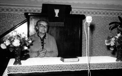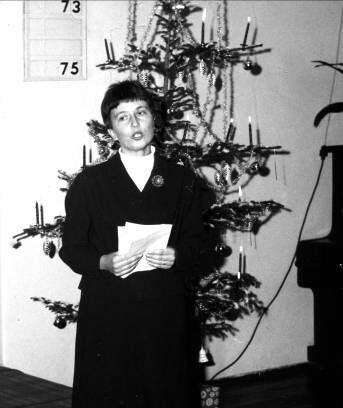 Největší díl práce spočíval ovšem na manželce br. faráře, která po organizační stránce zajišťovala bohoslužby i nedělní večerní shromáždění, vedla administrativní práci ve farní kanceláři, k vedení Nedělní školy jí přibylo i učení náboženství v obou zábřežských skupinách, starala se o ústřední topení a konala mnohé další práce nezbytné k normálnímu chodu sborového života. Mezi jiným také připravila a vedla dětské vánoční shromáždění, jež se jako obvykle za účasti dětí ze Zábřehu a okolí i sudkovské diaspory konalo na Hod Boží odpoledne a odsud je i tato její fotografie.