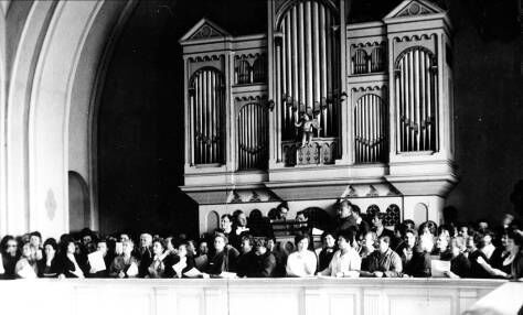 Část seniorátního pěveckého sboru – na kruchtě suchdolského kostela. Vpředu možno rozeznat i některé sestry ze Zábřehu.