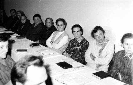 Vedle sestry kurátorky Hudcové sedí Věra Gregorová ze Zábřehu, vedle faráře Trusiny je Jaroslava Holubcová ze Zábřehu