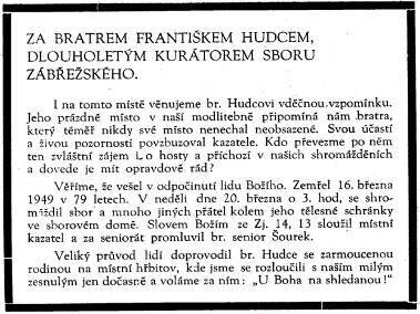 Přesto, že se dožil br. Hudec vysokého věku 79 let, nás zpráva o jeho náhlém odchodu překvapila. Téměř od práce odešel na věčnost. Jeho místo v kostele je trvale uprázdněno.Schází mi tam. A schází hostům, které vždy mile vítal. Zůstává po něm památka, sborový dům a sbor zábřežský. Jeho jméno je těsně spjato se sborem. Je po br. Hudcovi smutno, schází nám.