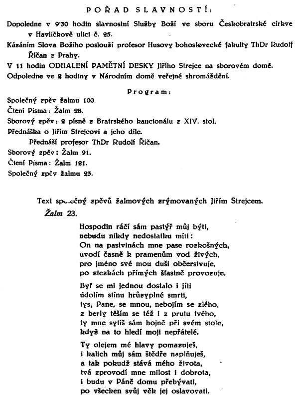 Odpoledne ve 14 h konala se slavnost v Národním domě za účasti asi 400 osob. Asi ¼ byla z jiných církví. Zpívaly se společně žalmy 100. a 23. Pěvecký sbor zpíval 2 písně z 16.století a žalm 91. Dr. Říčan přednášel o díle J. Strejce a krásně vyzdvihl hodnotu žalmů a doporučil je ke zpívání. Místní kazatel přečetl žalmy 28. a 121.